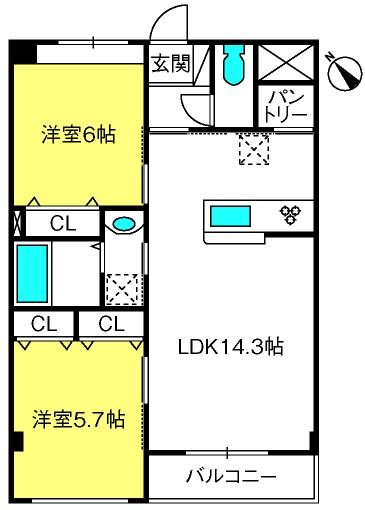 2LDK( 洋室6.4畳/洋室5.7畳(*階)/LDK12.7畳(*階) ) |