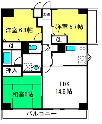 3LDK( LDK14.6畳/洋室5.7畳/洋室6.3畳/和室6畳 ) |