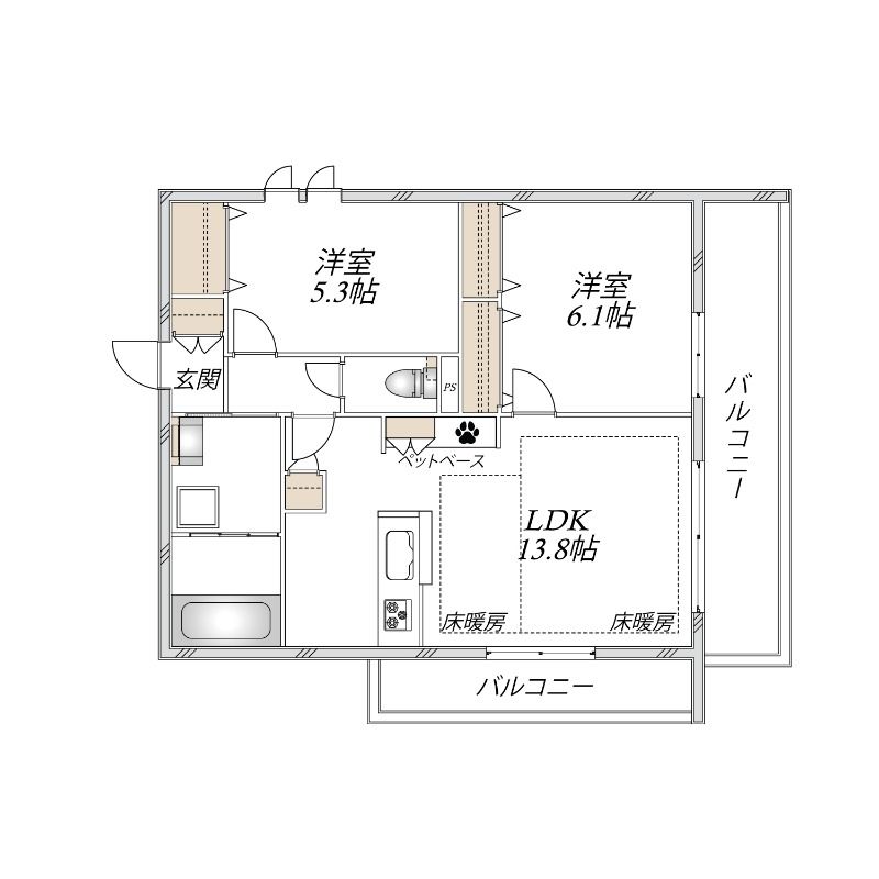 2LDK( LDK13.8畳/洋室5.3畳/洋室6.1畳 ) |